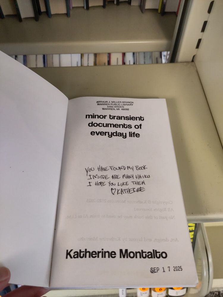 My book, Minor Transient Documents of Everyday Life is available at the Warren Public Library, which means, if you have a library card in the suburbs of metro Detroit, you can check out through the inter-library loan system! Check it out now! It’s coded 811 M in the poetry section of the Arthur J. Miller Branch Library. Currently, it’s on the ‘New Books’ shelf near the circulation desk. I don’t know how long they stay on that shelf.